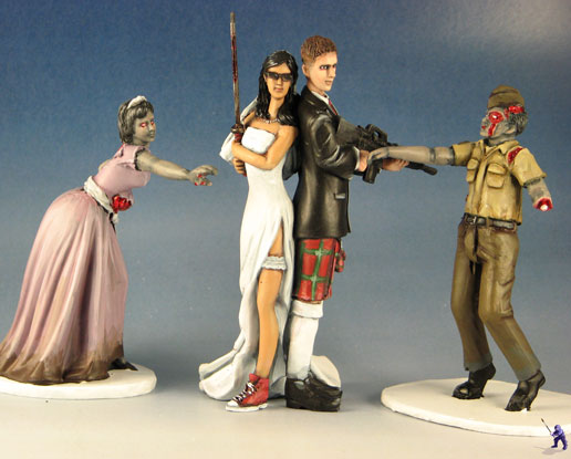Flowers are nice but cake toppers are AWESOME! Cake toppers are a fun way to express you and your fiance’s personalities. I love going to weddings where the bride and groom have cute figurines that either represent them as an individual or them as a couple. I know that I am a monstrous fan of El Dia de Los Muertos. There is a good possibility there might be a skeleton bride and groom on my wedding cake. A cake topper is definitely something that, as a couple, you can keep forever to remember all the wonderful memories of your wedding day, and your yummy cake!! 🙂