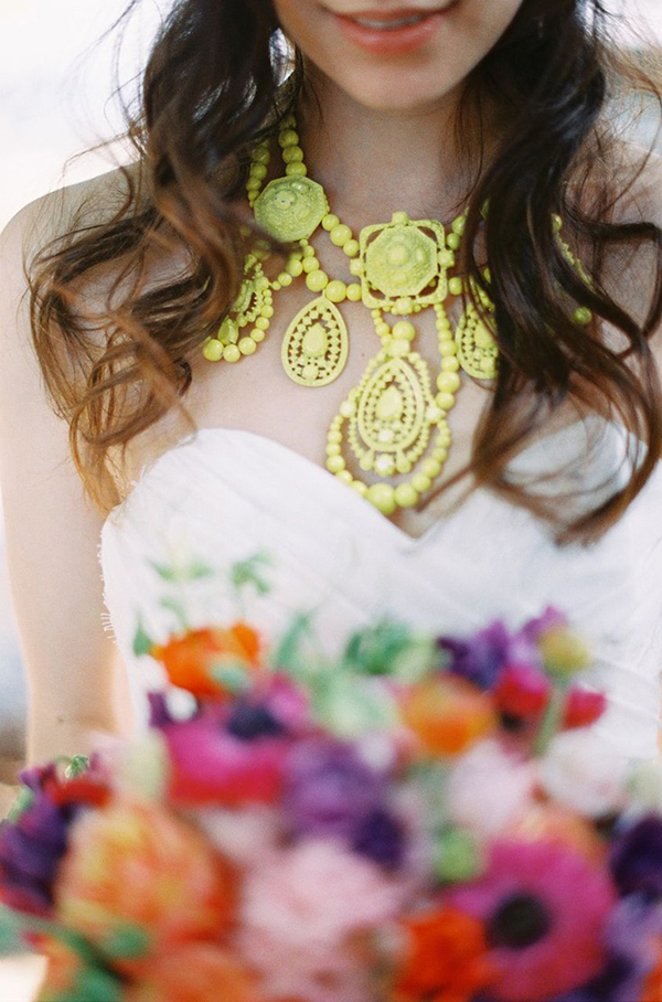 There is something so classic and timeless about a simple strand of pearls or a pendant necklace. But for the more funky, edgy, fashion-forward bride, those simple strands just aren’t enough. A bright, beaded necklace is so fun and definitely ties colors together. I am so in love with these! Every bride should try these with their dress! You might be surprised by how much you love them 🙂