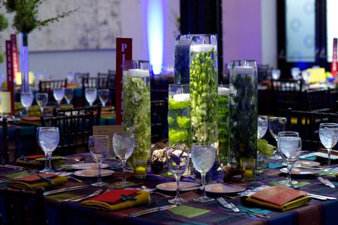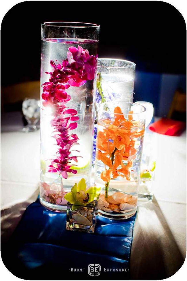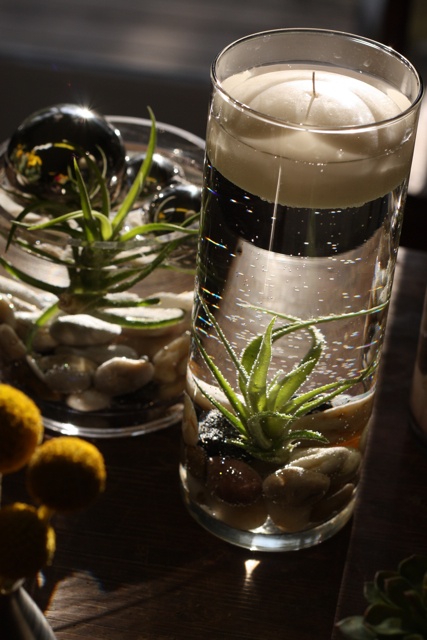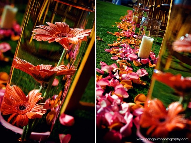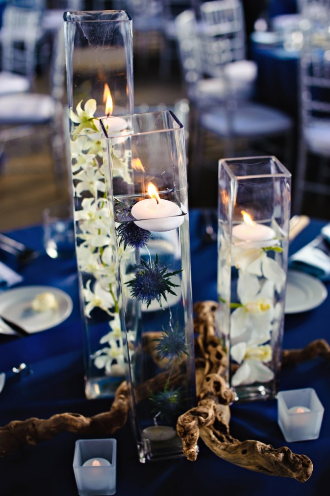 A style of centerpiece that I have always loved is submerged flowers. When I walk into a reception and see them on the table with the glass catching the light from the sun or candles, it definitely makes me say, “Wow! How beautiful is that!” You could use any flower, in any type of vase, to achieve the look you are going for! They are so unique and romantic, and I just can’t get enough of them. 🙂